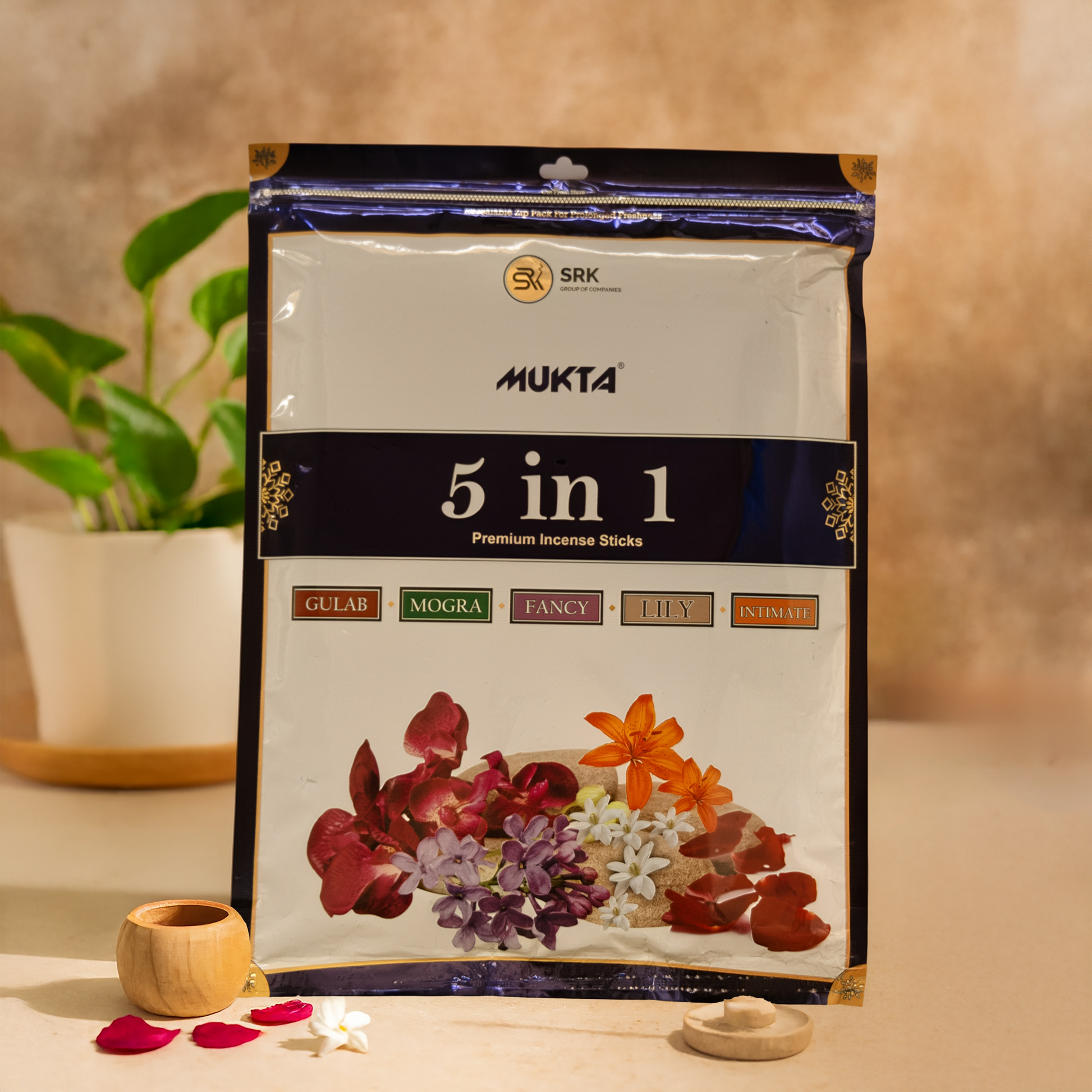 Experience five worlds of fragrance in one pack with Mukta Agarbatti’s 5 in 1 Zipper incense sticks. Thoughtfully curated with a blend of Gulab, Mogra ,Fancy, Sugandh and Herbal, this collection is designed for every mood and occasion. Whether you wish to invite calm during meditation, add freshness to your home, or set a devotional atmosphere for prayers, this pack ensures you always have the perfect fragrance at hand.